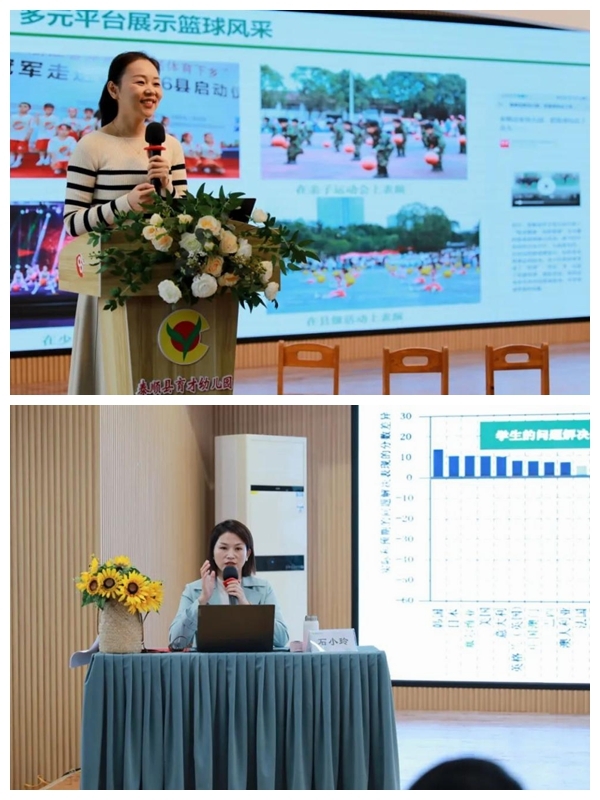 泰顺县育才幼儿园副园长周亚娟向大家分享《悦动健康 玩转篮球——幼儿园篮球活动游戏化实施的行与思》。她从课程建设出发,介绍了育才幼儿园篮球游戏化实施的具体路径,阐述了篮球游戏的特点、内容和实施策略,七个一篮球游戏改编法,项目化五步玩探法等多元实施途径,展示了该园多元、扎实的篮球运动课程。