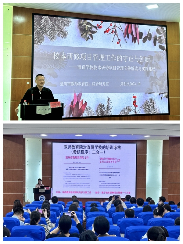 温州市教师教育院综合研究室郑明义老师作市局直属学校校本研修项目管理文件的解读,提示市直属学校在踏实做好校本研修项目管理的基础上,要努力推进校本研修模式迭代升级,在实践中优化研修工作。