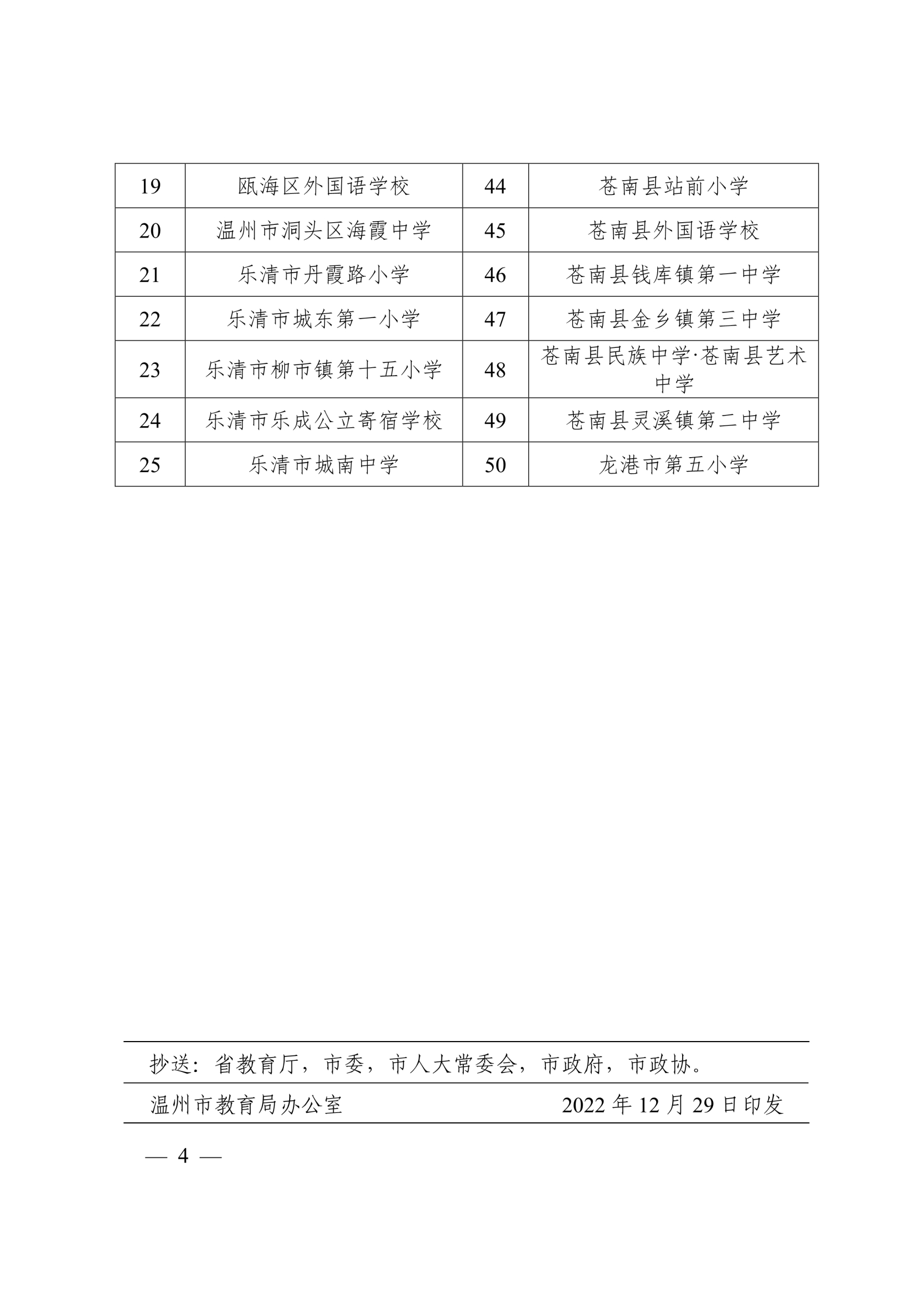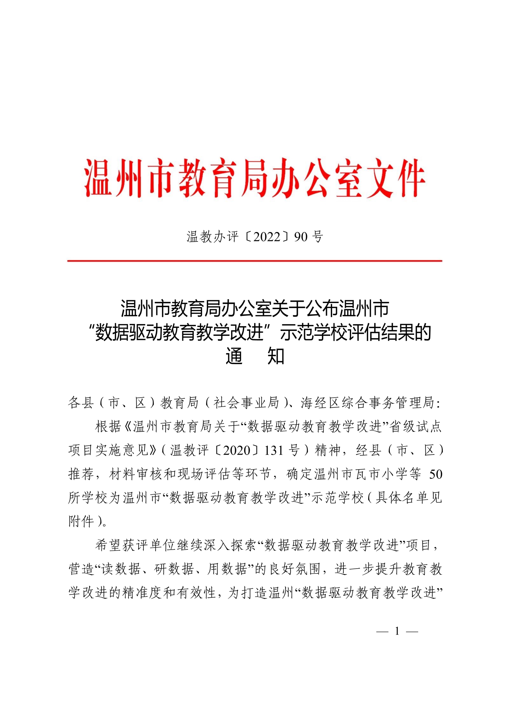 温州市教育局办公室关于公布温州市“数据驱动教育教学改进”示范学校评估结果的通知