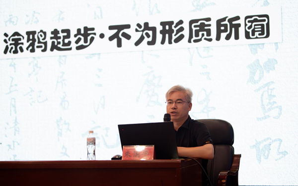 温州大学朱国平教授带来讲座《书法艺术的精髓与心得》,朱老师的教学方式注重实践与理论的结合,他不仅传授书法技巧,还鼓励学习者进行自我思考和练习。他强调书法学习不仅仅是技巧的学习,更是审美能力、耐心和专注力的提升过程。他认为书法“会通八法,挥洒平衡”,注重思考,总结,量化。他强调书写时各种书体的技巧可以融会贯通。朱老师认为书法不仅是写字,更是一种艺术和文化的体现,它要求学习者用心去感受和表达。他提到书法的学习需要恒心和毅力,强调了持之以恒的重要性。朱老师对书法的感悟深刻而全面,他不仅关注书法技巧的学习,更强调书法作为一种艺术和文化的重要性,以及它对个人修养的提升作用。他的教学理念和方法为在场的老师提供了宝贵的指导。