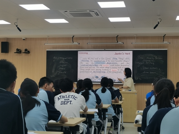 随后,张如烟老师呈现了必修三unit3 listening and talking的公开课。张老师通过轻松幽默的开场让课堂气氛活跃起来。随后和学生分享她的朋友justin外出贵州旅游的文字和图片,创设相关情境引入本课话题。听前环节,张老师通过三张有关苗族和侗族文化的图片,厘清本课生词,做好听前铺垫。听中环节,学生们需抓住关键信息,完成改编后的听力文本填空任务。完成听力后,张老师带领学生对听力文本进行详细解读,着眼于其中的芦笙、苗族银饰、侗寨这三样文化项目进行解读,解读从特征、场合、作用、目的四方面展开。期间,张老师步步引导学生进行归纳,而后进行总结。听后环节,张老师先是拿出课前准备好的芦笙和苗族银饰,和学生进行示范对话。接着,在此基础上,学生运用总结的要点和相关句型进行同伴间对话,达到及时操练的目的。